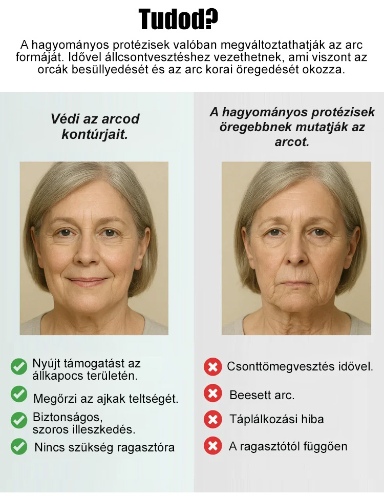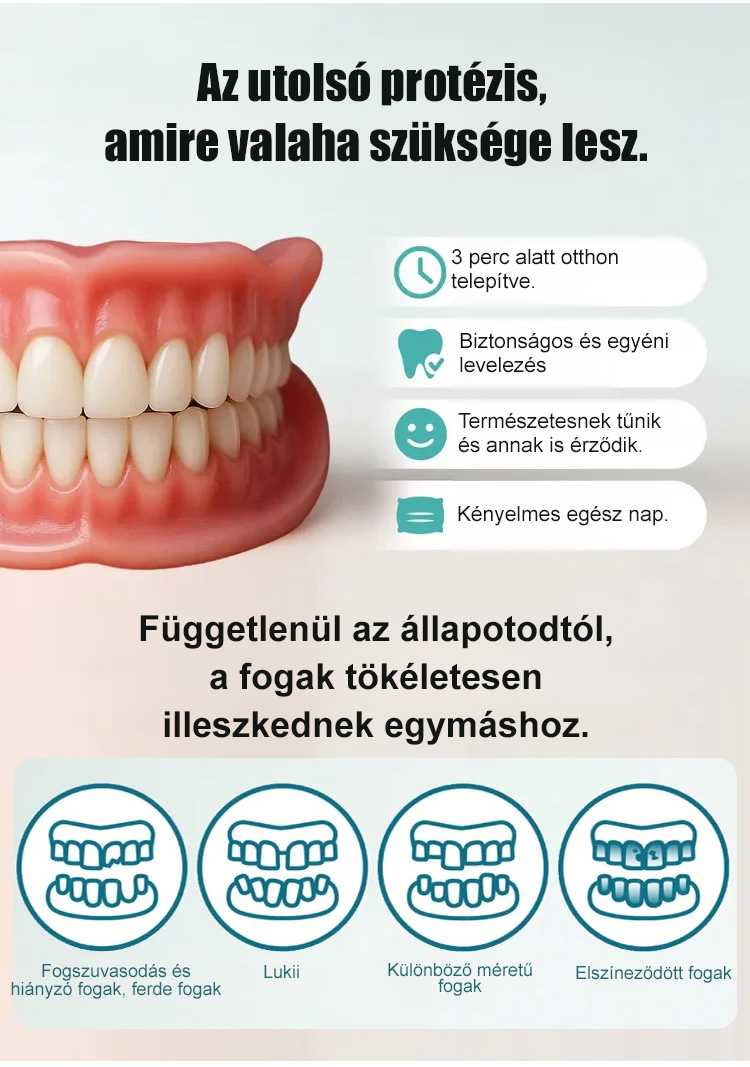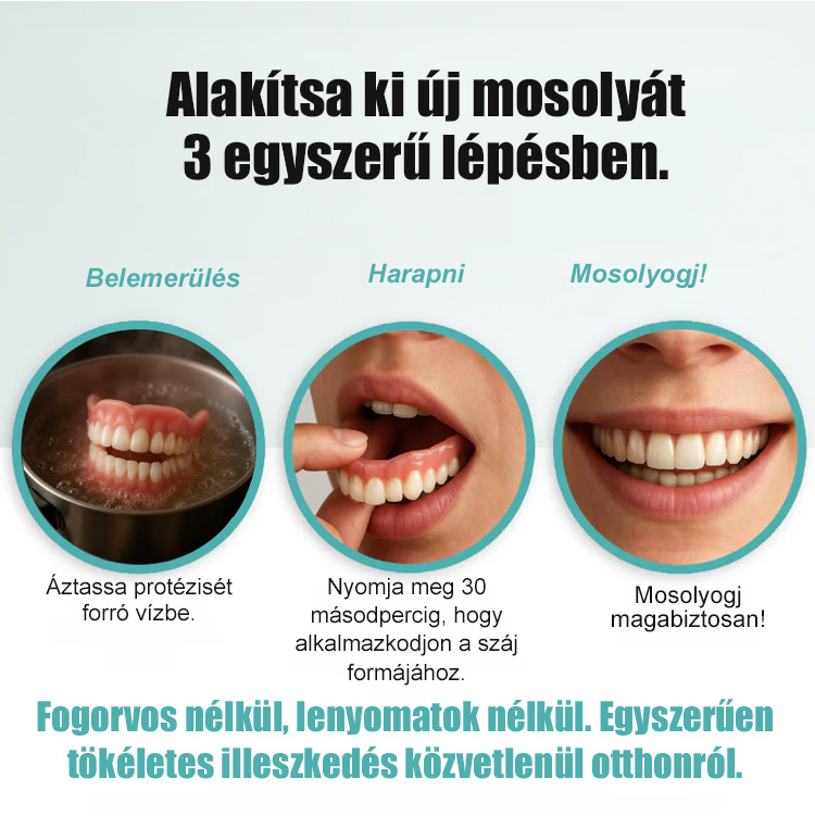 Miért költene vagyonokat implantátumokra? Az 5. generációs, puha szilikon fogpótlásunk azonnali és természetes megoldást kínál. Csak áztassa meleg vízbe, illessze a helyére, és élvezze a tökéletes mosolyt!